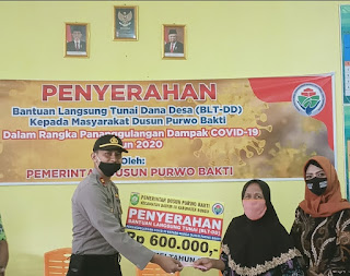 Lanjut dalam penyerahan bantuan langsung tunai Dana Desa (BLT-DD) untuk masyarakat dusun Purwo Bhakti lainnya secara bersamaan di pimpin langsung oleh Lenny Maryani selaku Datin Dusun Purwo Bhakti juga disaksikan langsung oleh kepala Kepolsek Muara Bungo Iptu Ivan Rifai S.Sos.I.M.Pd, Drs Asri MM, Camat Bathin III, Babinkamtibnas Bripka Purnomo Babinsa Suherman, Pendamping Desa M. Taher, ketua BPD serta seluruh tokoh masyarakat Purwo Bakti.